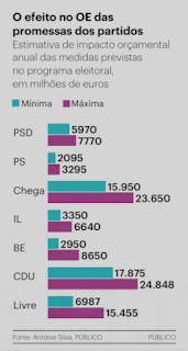 Este gráfico do jornal Público, baseado num estudo do Iscte sobre os custos dos programas eleitorais, mostra que, para além da tradicional incontinência e falta de seriedade política do PCP e do Chega, a AD também revela uma inaceitável demagogia política, sobretudo quando comparado com a responsável contenção do programa do PS, o que, em partidos que pretendem a renovação do mandato governativo, é de uma supina irresponsabilidade orçamental. É evidente que eles não contam cumprir as promessas que fazem e que incorrem numa operação não séria de compra de votos.