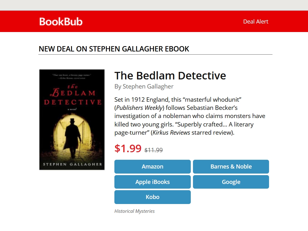 Crown are running a price promotion on The Bedlam Detective ebook from now until October 7th, with an additional targeted placement to 3 million Bookbub subscribers in the US and Canada on October 1st.