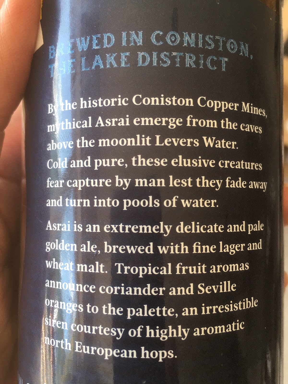 So what's prompted me to be telling you this now? Well, getting back after a four-hour walk on the hottest day of the year so far, I called into the Post Office to pick up a cold beer or two. Don't judge me, I'd earned it. The Lake District boasts a number of craft brewery labels, but one in particular caught my eye; on the front the image of an ethereal lake creature, and on the back, "By the historic Coniston Copper Mines, mythical Asrai emerge from the caves above the moonlit Levers Water. Cold and pure, these elusive creatures fear capture by man lest they fade away and turn into pools of water."