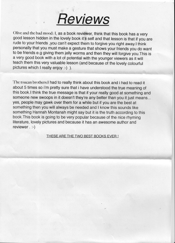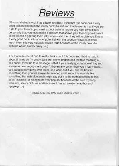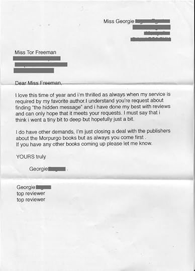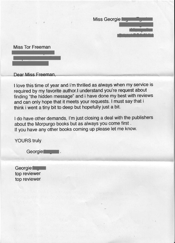 The most exciting post came, from my cousin and longterm reviewer, Georgie (aged 11)! Of course I was nervous about her responses - as she mentions in her letter she is a busy person! In my request letter I was, of course, respectful of that... But she's come up trumps! And glad to see she's got her priorities straight re the Morpurgo/Freeman issue.