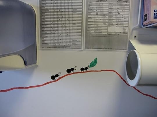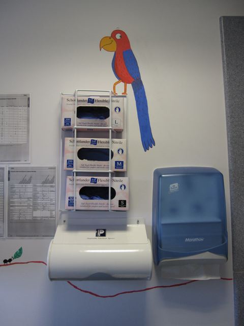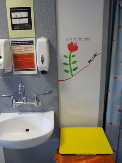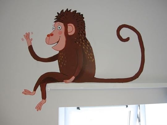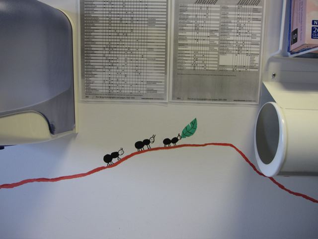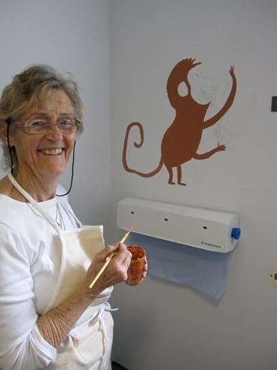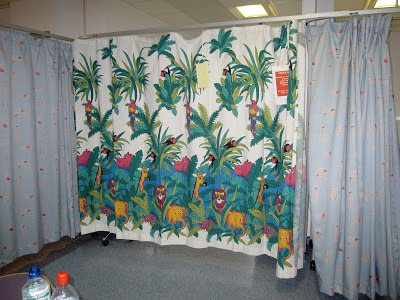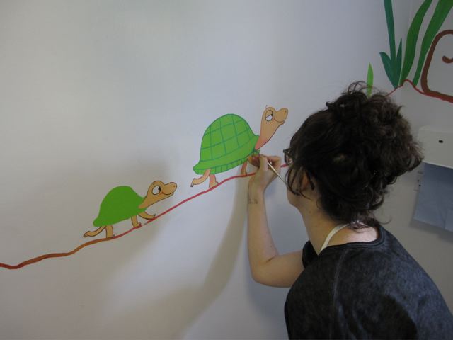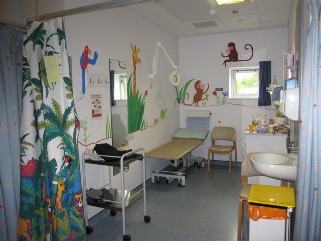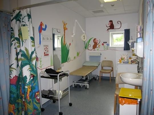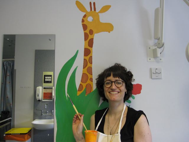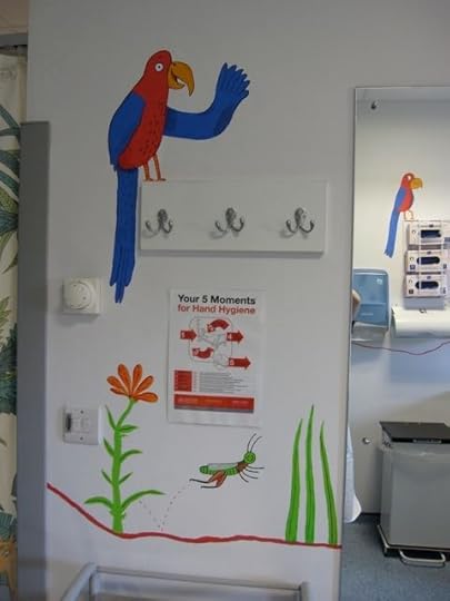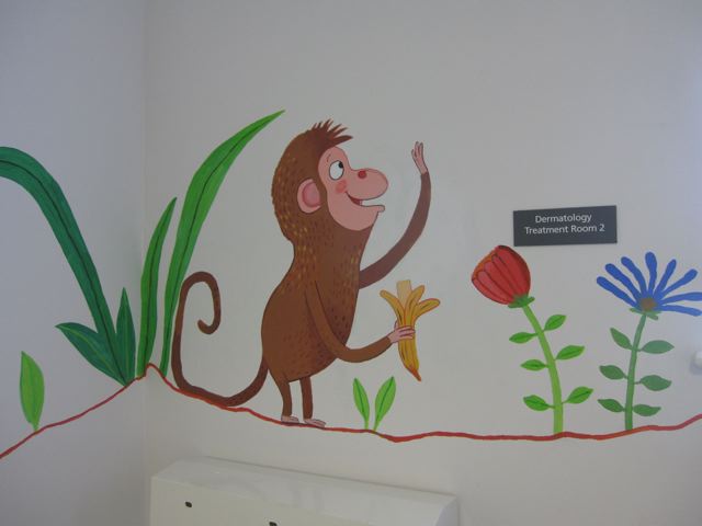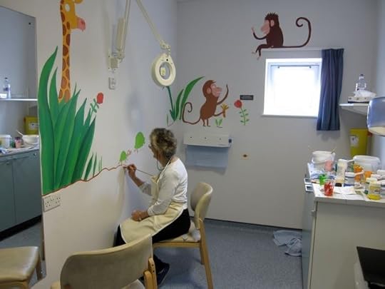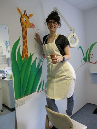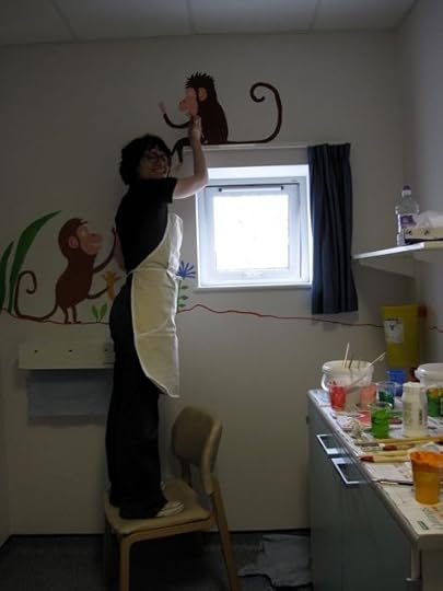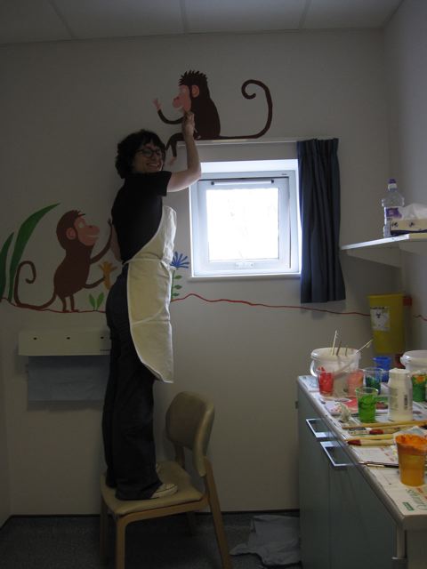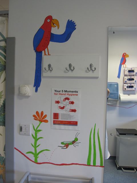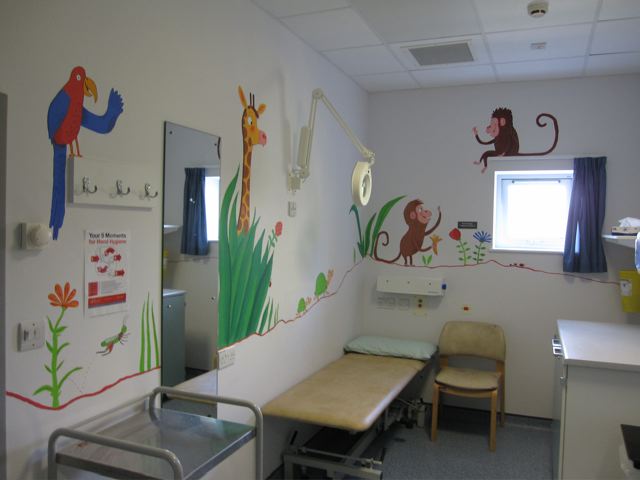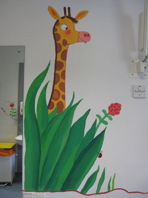 So when they asked if I knew anyone who could do a mural in the children's dermatology suite I volunteered myself and Mum. I felt quite apprehensive in the run-up as I'm used to drawing animals thumb-sized rather than giant, but we ended up having a GREAT weekend, and think the paintings have brightened up the children's cubicle. We hope the staff at Queen Mary's will agree!