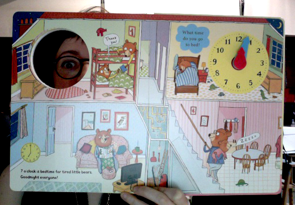 It's a lovely big board book with two flaps on every page as well as a big yellow clock which makes very satisfying clicks when you move the handles.