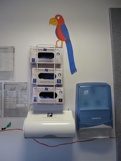 Parrot hanging out with the latex gloves.