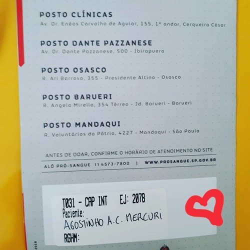 Aos amigos que moram em São Paulo que puderem, quiserem, tiverem condições, peço com muito amor que doem sangue ❤ É só comparecer a um dos postos e passar os dados que estão na etiqueta. Meu marido Agostinho Mercuri está internado no @institutodocancersp desde 27/09 sem previsão de alta. Seguimos em frente com muita fé, gratidão e amor. Obrigada