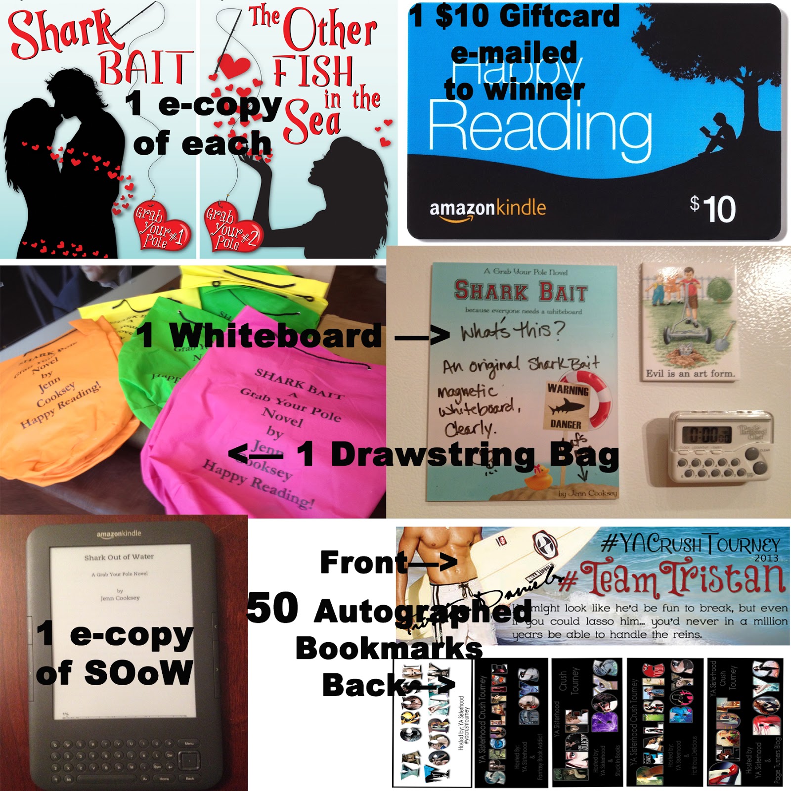 E-copies of Shark Bait & The Other Fish in the Sea$10 Amazon gift card (e-mailed to winner)Shark Bait drawstring bagOriginal Shark Bait refrigerator whiteboardE-copy of Shark Out of Water to be received on release day60 #TeamTristan/2013 YA Crush Tourney Bookmarks