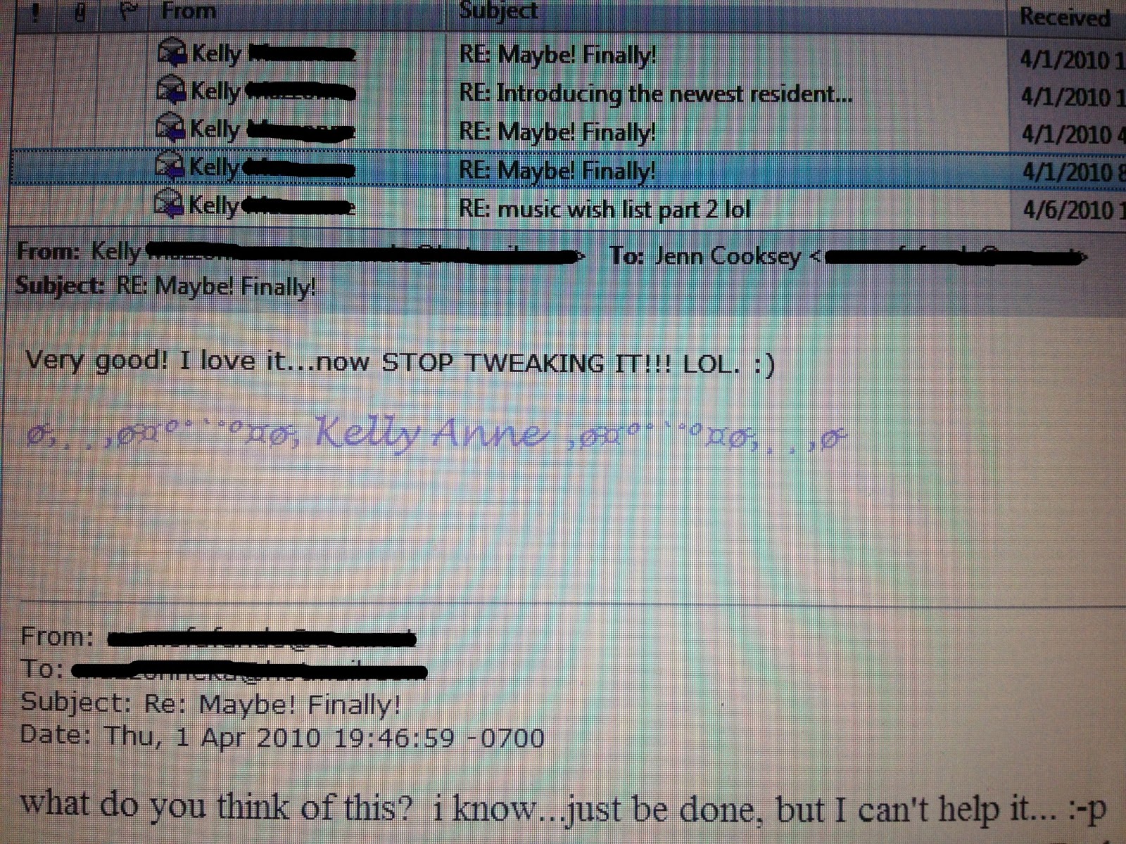 Kelly and I used to email CONSTANTLY. <—That ain't bullshit or even a small exaggeration, folks. Before she took a new job that had her working in the field, Kelly and I emailed each other back and forth about ALL kinds of nonsense (mostly books, Buffy, and...well, mostly that stuff) many upon many times throughout the day and not only that, our email titles very rarely had ANYthing to do with the content of said email. It was fun for us to come up with amusing and giggle-worthy subject lines and if you didn't have a guess before now, Kelly and I can on occasion, be very creative. It was our habit that every single word I ever wrote in the beginning was copied and pasted into an email and she would then read it and give me feedback immediately (instant gratification FTW!) via email. Now what I find sort of funny about all of that is that the email documenting the honest to God beginning of the GYP Series was titled, new story. That's it. It wasn't even capitalized.