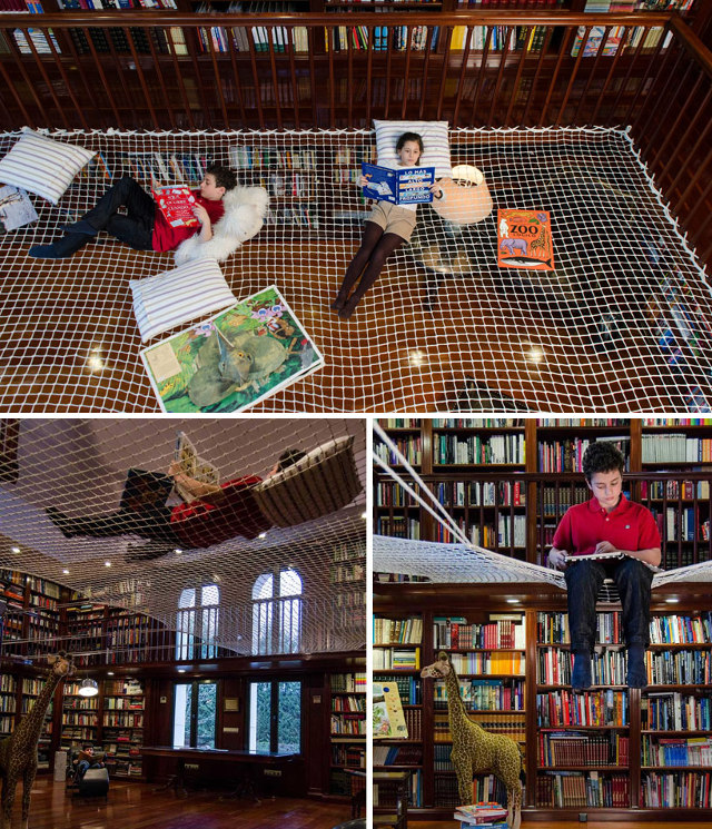 Clockwise from left: patchworkurchin.tumblr.com / bookbub.com / onekindesign.com / homeedit.com / And for something really out there...a library net!(how awesome is that??)
