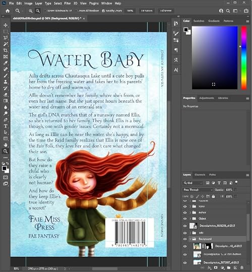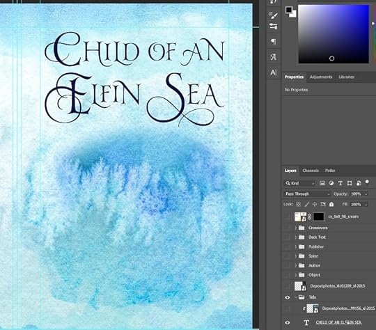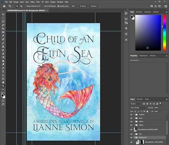 For me, cover design isn’t a linear process. I went through several iterations for the mermaid object and the field around her. For now, I want to look at what I did to add text.