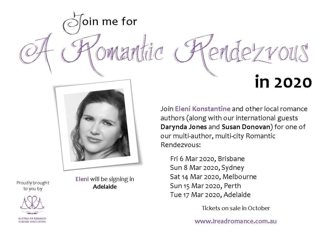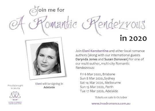 As some of you will know, I am participating in A Romantic Rendezvous, a book-signing event in Adelaide on 17th March, alongside authors like Darynda Jones, Susan Donovan, Trish Morey, Elizabeth Rolls, Lilliana Rose, Suzie Hindmarsh-Knights, Maggie Mundy, Leesa Bow and more.