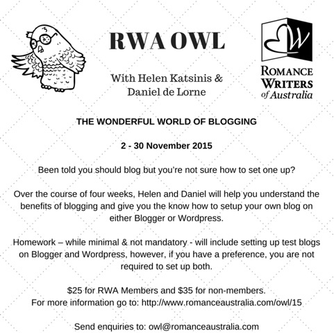 Blogging OWLAs mentioned in an earlier post, I'm co-presenter in online Blogging workshop for Romance Writers of Australia. Week one's lesson went well with Daniel de Lorne presenting the bulk of it (he kindly took the lead in while I've been recuperating). This week Dan will talk about Wordpress, and the following week, I'll talk about Blogger.