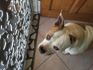Our pup (who is almost 9 years old) had surgery to remove some cancer spots and is doing well now a few weeks later. Here he is waiting for my brother to come back home. Yep, she's a cutie but a cheeky one.