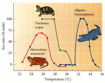 Il progenitore comune di tutti i vertebrati, circa 300 milioni di anni fa, era cosi’, i suoi “bambini” nascevano maschi o femmine in base alla temperatura. Questo meccanismo si e’ mantenuto in alcuni vertebrati: tutti i coccodrilli, molte tartarughe marine, alcune lucertole, alcuni anfibi, alcuni pesci.