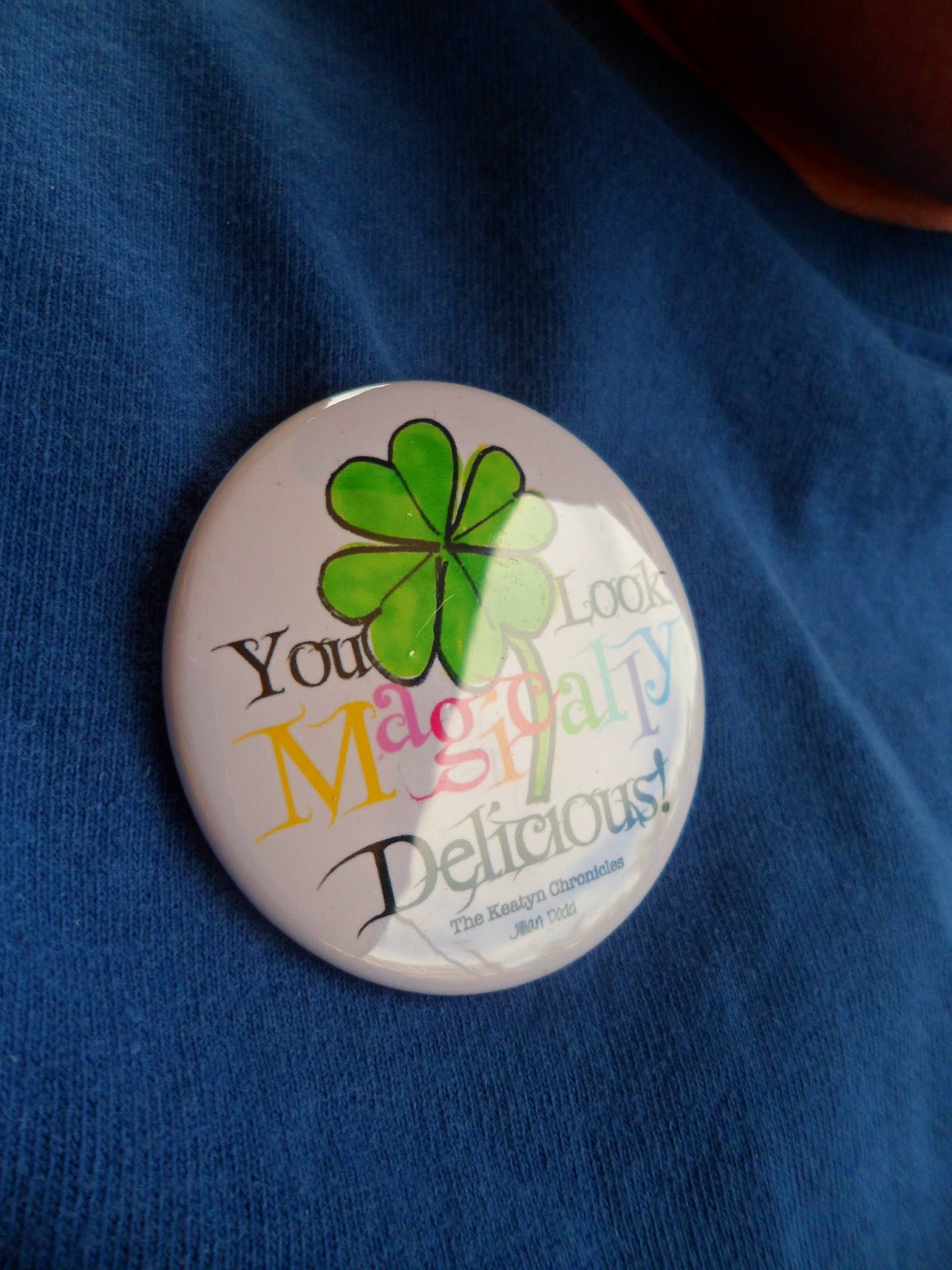 He doesn't believe that he looks "Magically Delicious" like his button from Jillian Dodd says