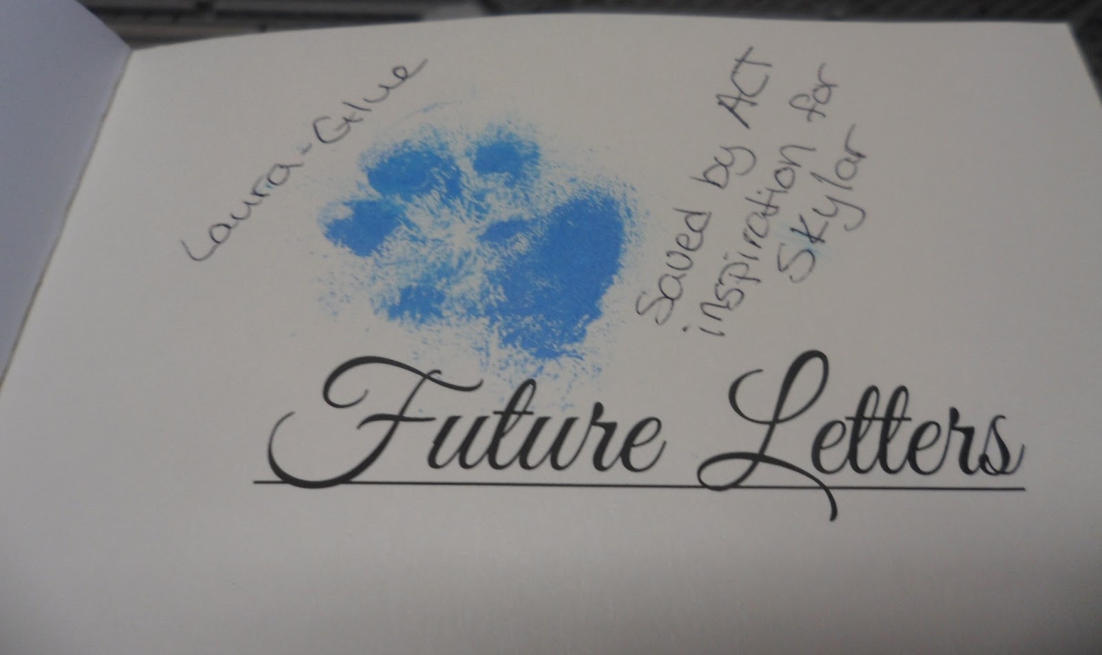 The rescue group we fostered and then adopted her from is having a fundraiser and my husband suggested I donate a signed copy of Future Letters for the silent auction. I decided to do one better. The donated copy is signed by me and Laura-Glue.