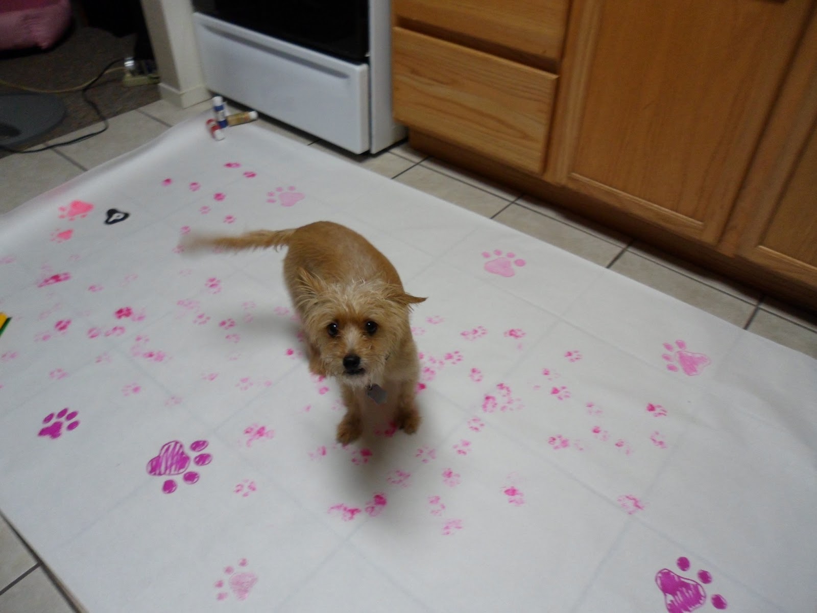 And while we're on the subject of Laura-Glue's paw print... Here's a picture of her pawographing the banner for Pink Paw Prints (our Komen Race for the Cure Team).
