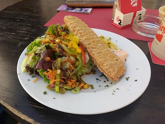 Of course, lunch rolled around rather quickly, so I ordered something that seemed healthy enough: fish with potato salad. Of course, I assumed cod meant grilled cod, but I should know better by now: it was fried. But that’s okay, because it was rather good.