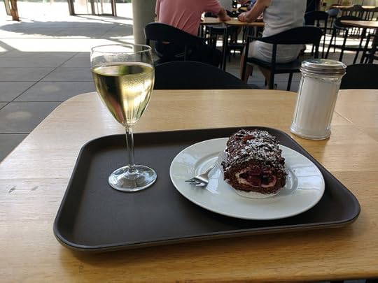 Of course, I got peckish and needed a snack. And a glass of wine. I had to leave the a/c to get it (WTF, Munich? Can’t we eat in a/c SOMEWHERE IN THIS GODFORSAKEN CITY?), but it was a little breezy, so I didn’t sweat it too much. I figured I would feel better if I had this chocolate roll thing with Bavarian creme and cherries inside of it, and I was right.