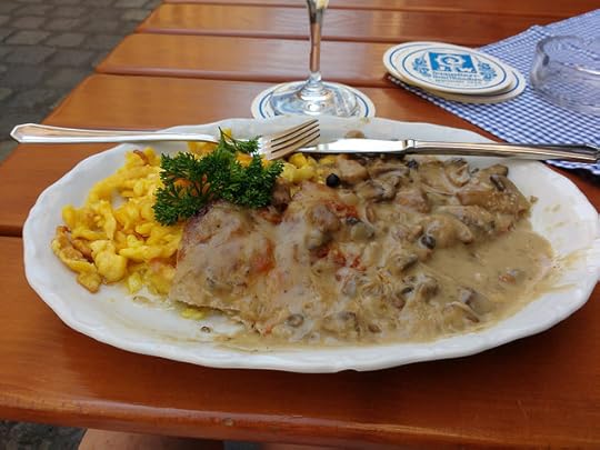 So I got up and went to the restaurant at the Platzl Hotel and randomly chose the day’s special: jagerschnitzel with spatzl. I had no idea what I ordered, but when it arrived, it was tasty.