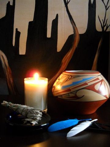 The process began by choosing one of my favorite pots. It was purchased in Santa Fe a couple decades ago and created by C.G. of the Jemez Pueblo. Its motifs are carefully defined and the artist used bright turquoise on one side. I added to this a sage smudge stick from The Ark, a metaphysical store in Santa Fe, a candle and several colors of feathers, one turquoise to repeat that color in the montage.