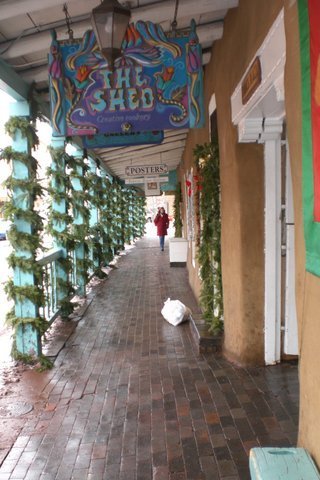 Let’s walk a block and make a left onto Palace Avenue. The Palace Avenue site was later inhabited by the Manhattan Project during top-secret development of the atomic bomb in Los Alamos during WWII. Mail came to a P.O. Box rather than to the covert headquarters. It’s now the home of The Rainbow Man, since 1945, where the shopper can buy jewelry, folk art, masks and pottery. I dare you not to buy anything.