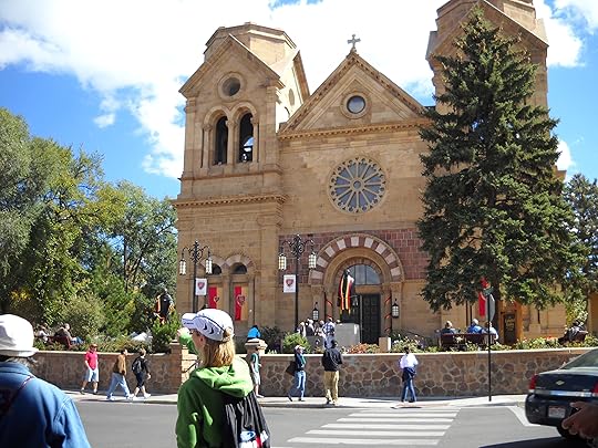 or commonly known as the St. Francis Cathedral. The cathedral dominates the downtown Plaza area. It’s one of the first stops made by visitors to the City Different. It’s on Cathedral Place, within our sight as we stand on the sidewalk under the portal (porch). Cross the street. Okay, everyone run up the steps!