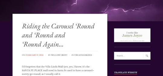 My thanks to Willow for her fun and unique take on reviewing. Due to a lengthy winter storm, this is making a late appearance. And yes, I too know the carousel at Santa Fe Place is long gone, but it was still circling when I wrote the book.