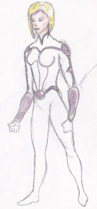 Design-wise, I envisioned Machina in a white V-suit that matched my original idea for Sam’s, with her outfit made-up of purple circuit-patterns where Sam’s was gold. Picturing actors in the role of my characters always helps me in creating them. I imagined Machina as a cross between Brie Larson, Alison Lohman and Stephanie Bendixsen, only British, and sketched out a rough idea of what she might look like to get a handle on describing her.