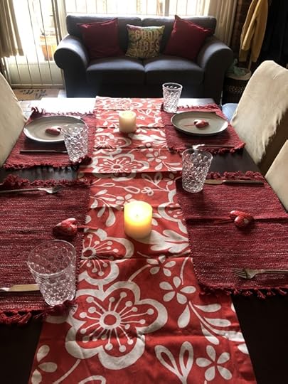 Last month was Valentine’s Day so I set the table with a red table runner, red placemats, white plates and candles.