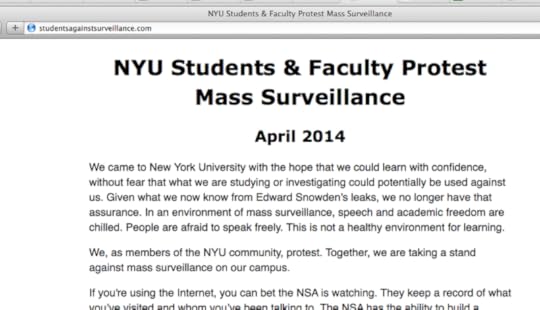 On May 7, the Electronic Frontier Foundation published an electronic call to arms: "Join Students and Scholars In Speaking Out About the Effects of Mass Surveillance on Campus". It mentions an initiative I've been involved with over the last few weeks: after a meeting between the EFF and the Student Net Alliance, I was one of three NYU students (the others being Luc Lewitanski and Hannah Weverka) who wrote an open letter protesting dragnet surveillance, talking about how it negatively impacts students as a subset of the population.