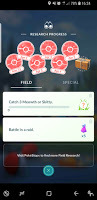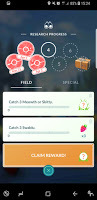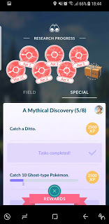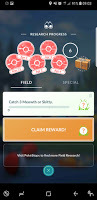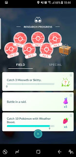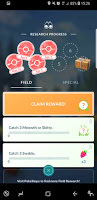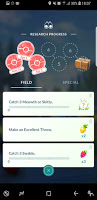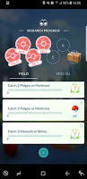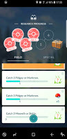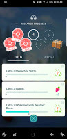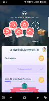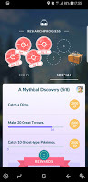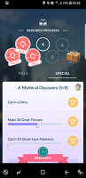 I was not so pleased to see the return of the quest to catch the currently scarce Meowths and Skitties. The interesting thing was that having a completed but not collected task did not mean you did not get a third task to do. I liked that, too. By the end of the day, I had four Field Research Tasks - one that had been completed, and three that needed completion - and I had made progress towards, but not completed stage 5 of the "A Mythical Discovery" series.