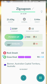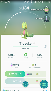 That was last Tuesday. I caught nothing new until Saturday, after the Hoenn release went live. Yesterday, I caught treecko in some open grassland beside an urban public walking track, and the slakoth further up the walking track under the shade of some pines.