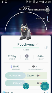Sunday morning, I tried walking in a more central urban area in the early morning, and I was surprised by the variety of new pokemon I found amongst the rattata, pidgey, and hoot-hoots. They were as follows: a poochyena (of which I saw three or four, but didn't stop to catch them all as I was doing an Ingress mission);