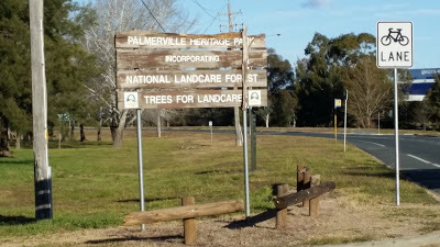 Palmerville Heritage Park - the sign at the entrance to the park. This is a short walk from the car park, and can be accessed safely if you walk through the nature strip between the car park and Owen Dixon Drive. Do not stop in the entryway to access it from your car; it's not safe. This portal is also a pokestop.