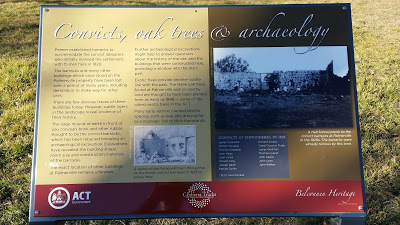 Convicts, Oak Trees and Archaeology - the first historical information sign. Recently refurbished by Canberra Tracks, this sign looks different to the one displayed as part of the portal. it marks where the convict labourers were barracked on the Palmerville property. This portal doubles as a gym.