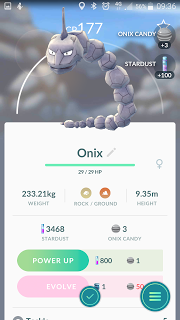 This wasn't the only onix I caught today, but it was a good strong one, with good stats. The second one, needed improvement to battle, so it assisted with the candy supply.