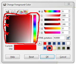 To change the colour, I can click on a black area in the large coloured square on the left, or I can click on a black square in the rows of little coloured squares on the right.