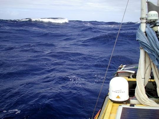 I corral my sandals, and begin bailing with the stray porridge bowl. It’s hardly worth the effort. As fast as I fling it out, the water comes back in either as rain or crashing waves. It’s more for my sanity. I know from past voyages how the sound of water slopping in the bilges will grate on my nerves after a while.