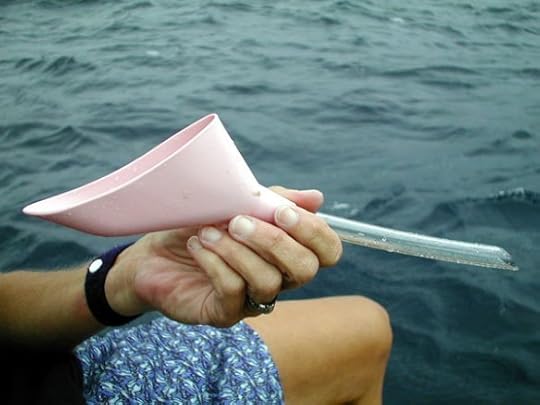 She holds a pink funnel, out of which extends a transparent tube like a retractable dick. April smiles smugly, and announces, “I am about to pee off the side of the boat like a man!”