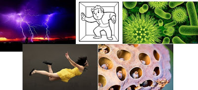 Arachnophobia – The fear of spidersOphidiophobia – The fear of snakesAcrophobia – The fear of heightsAgoraphobia – The fear of open or crowded spacesCynophobia – The fear of dogsAstraphobia – The fear of thunder and lightningClaustrophobia – The fear of small spacesMysophobia – The fear of germsAerophobia – The fear of flyingTrypophobia – The fear of holes