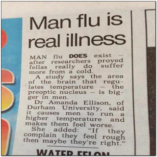 I have the flu. Or rather I have Man Flu. It is no joking matter. I am a woman with man flu and I feel as though I am dying. The plight is real.