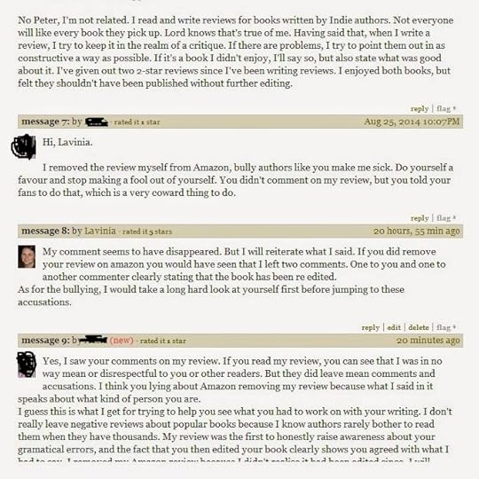 Now if you actually find the original review you will find message 7 has disappeared *shocking* she said that I did not comment on her review on Amazon, but later on she said that she knows I had. (Message 6 is from someone else.) You will see on message 9 that she contradicts herself.Later on she said that I was lying and she never said any of that, I had already commented saying I won't be commenting on that particular thread again, but I sent her a pm telling her that I had screenshot the conversation. Lo and behold she edited more comments.In the whole process of all of this I made one mistake by saying she had replied the day before, when it was the day before that. Woohoo big deal *rolls eyes*Now let me put this out there........... As a rule authors are not supposed to comment on reviews. This reviewer kept pointing this out to me as she continually tried to talk down to me. Goodreads even emailed me saying it can effect my public image.Let me tell you this............. I do not care, I will never ever just sit back and let anyone slander my name. I find the whole thing strange why a person would wait 14 months to copy and paste an old review just as my book was being advertised.Why did she feel the need to keep contradicting herself and deleting and editing her messages.There are genuine readers out there who leave a low star review, and when they are done on my books I will read them and see if there is anything I can change, whether it be editing or something similar. If it is the style or the fact that the person fell in love so quick then no I can't do that. I have seen reviews saying no one falls in love that quick............ bull.I met my husband and within 4 days we were engaged. Yeah fast moving for some people, but guess what....... it happens, and we have been together for 14 years :)But that is that particular reviewers opinion and if they don't like that type of thing then fair enough, my books aren't for everyone. It is like me and my husband, what I read, I am 99% certain he would never read and vice versa.