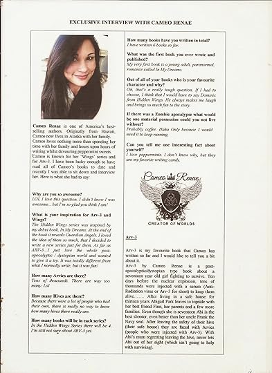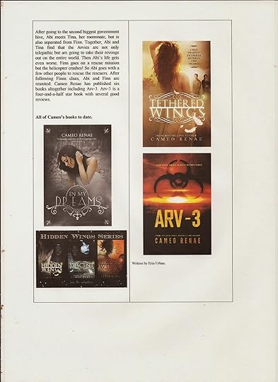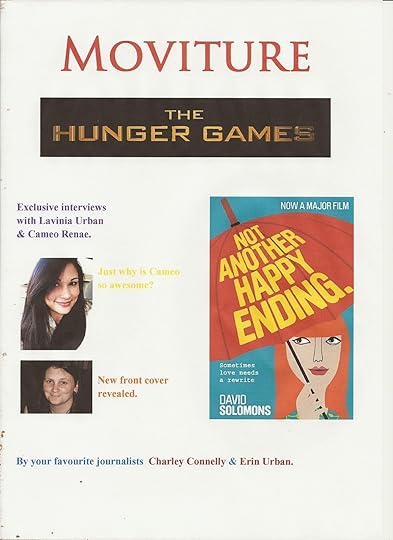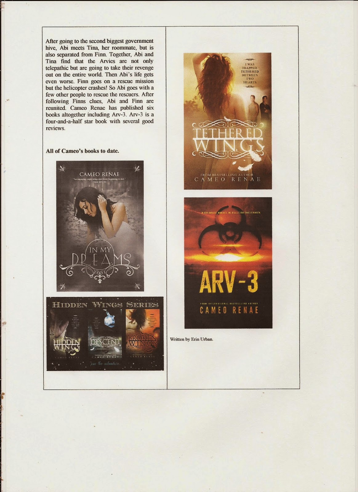 So my daughter Erin, who is twelve, had an English Assignment which is due in tomorrow - 24th March 2014. For this assignment she and a friend have to create a magazine. The magazine is all about books and books that are now movies. She told me that as soon as she was given this assignment she knew that straight away that she wanted to interview me and after finishing reading all of Cameo Renae's books she knew she had to interview Cameo as well.Now I have to say I am quite the proud parent and after all her pieces were printed off I uploaded and tagged Cameo in hers but I thought 'Why not share it all with everyone else?' so after getting permission from my daughter here is her magazine.