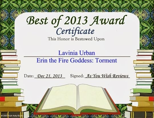 Wow it has been awhile since I have blogged. I am so sorry for that. I told my last year that I would try to blog at least once a week. It didnt really work out as planned. Well I am here now with bells on *jingle jingle*I'm trying to think what has happened since I last properly blogged. Hmmmm well you know about my daughter Erin's condition. Let's see what else is there. Oh yes I won an award for best cover of 2013 for my book Erin the Fire Goddess: Torment.