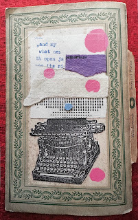 Dawn’s verbo-visual tropes are myriad: tearing paper to stanch the flow of text, typing dense patterns of text onto the base page of the collage, adding circles of paint (gouache to my eye) on the page, cutting and pasting Madonna-like faces onto most pages so that someone is looking at us as we look at her and the collage she inhabits, sometimes holding pieces of the collage down with paper clips (and other fasteners) instead of glue, circling words in the collaged texts to make us focus on the artist’s own interest, collaging onto the boards of the book instead of merely on blank paper , including repetends to the text (often “solitude”), so certain thoughts stay in the mind of the reader longer, and focusing on rough-hewn collage techniques—thus working in the style of dirty visual poetry, the rich and loamy soil so many of the best visual poems are grown within.