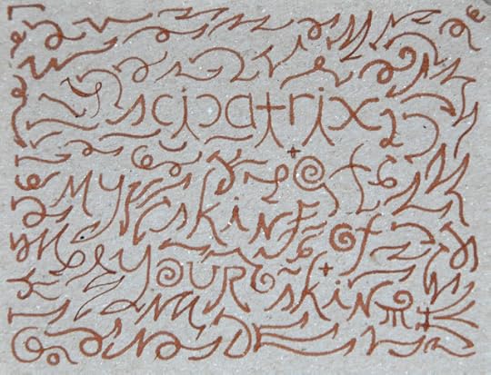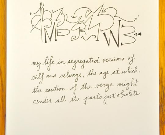 Sure, I had written this on my lap, and I was wearing a carpal tunnel brace at the time, but this was not working. My practice was failing. I created two others in this series that day, finishing one and a half others of these after the first. Then, upstairs at my desk, I wrote the text for the third and last of these emblem poems. Two of the g's are so malformed I can barely look at them, yet, it might be the brace that is the problem. Maybe my hand still works.