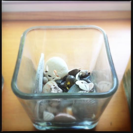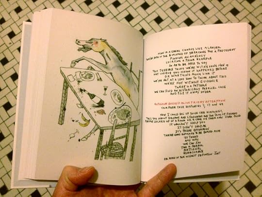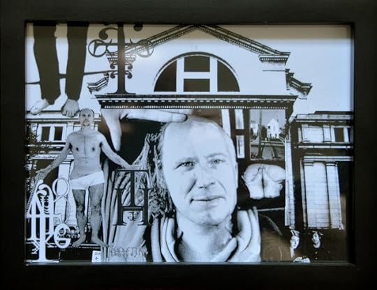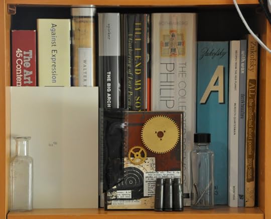 Lynn and Anne came bearing gifts. In the end, these are acceptable (meaning I could accept them), since Anne and Lynn had made them. Lynn's gift was a framed collage, one of her classic digital collages, which are always creepy (note the almost-naked man) and filled with detail. This one includes tree of my visual poems, lots of shots of my feet (maybe because they're my best feature), and a central face that is half bpNichol and half Robert Grenier. I recognized Nichol immediately, but not Grenier, whom I guessed was me, probably because I don't have a good sense of what I look like but this half of the face looked bald. And in the lower right corner of the collage is a photograph I took of my two children after they attended a reading of Lynn's in New York City. It is a strange little collage, just what I like, and it sits atop my dresser.