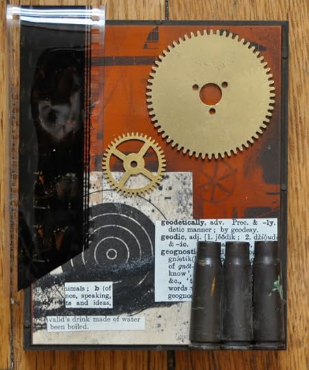 Anne brought me a bottle of riesling (already drunk) and an object poem collage. Immediately, I noticed that the snippet she had used from a dictionary included those words the closest alphabetically to my name, none of which has an f as its fourth letter, hence the title of this piece. The collage includes three bullet shells, three target-like figures (two of which are gears), and a few inches of 35mm motion picture film, which hid the missing F, the indentation for which Anne has left under the upper flap of the film. Anne has written about this piece on her blog.