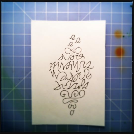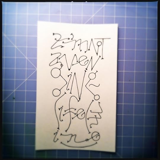 A fidgetglyph is an extemporaneous dance of the hand, so I do not know the end of it, or even the beginning, when I begin it. I don't not begin with words (and sometimes don't even include them); I begin with shapes that remind me of letters and that may grow into words as my hand explores the visual and semiotic possibilities of those inklings. So the opening character of my fidgetglyph "2'mNoT" may be a numeral 2 or a crossed capital Z or an I. This shows us the power of handwriting to support ambiguity, and ambiguity is the protyle of poetry. We create everything worthwhile out of it.