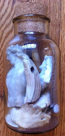 I placed all of these pieces except for the piece of a skull (which was too large for the mouth of the jar) into the jar, and I added to it a number of other items: Quite a few camel's teeth that I had procured while living in Somalia, a few of them drilled at one end so I could fashion them into keychains; the upper jaw of some small rodent; a tiny glass jar, stoppered with the tiniest of corks, and holding a small grey-blue seasnail shell; a small perfume bottle found in my backyard, empty but irisdescent from its life within the chemicals underground in a houseside midden; and a bottle of Chanel No. 22, nearly empty, nearly evaporated, but potent enough that if I open the larger encompassing jar, my nose is met by a smell more redolent that even the death that occupies that glass jar.