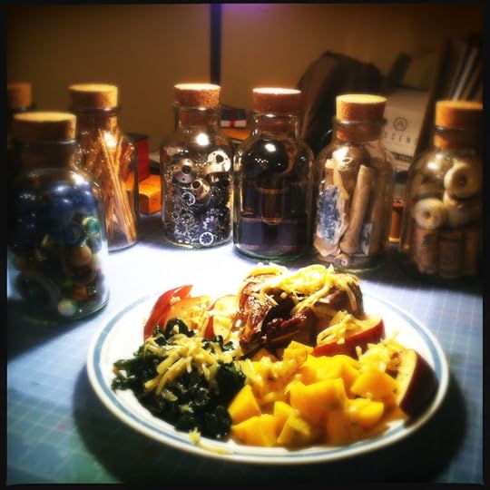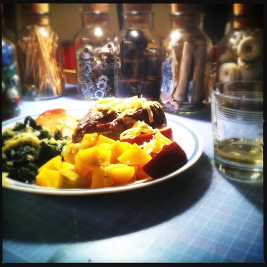 For once, I ate at my work table, surrounded by the jar poems I've been working on. They were lit nicely by the little halogen lamp there, and I placed a little glad of Peat Monster scotch next to the plate (not my favorite peaty Islay scotch, but I've left my Lagavulin with Anne Gorrick and Peter Genovese).
